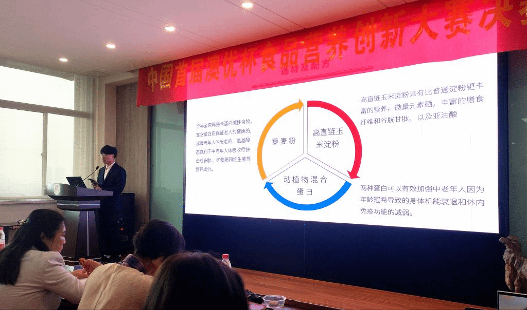 最后,澳优食品研究院营养品开发主管荣智兴进行总结发言。他对本次大赛给予了高度肯定,他认为校企合作可以加强企业与高校的产学研结合,希望与食品学院保持长期合作,为行业发展添砖加瓦。