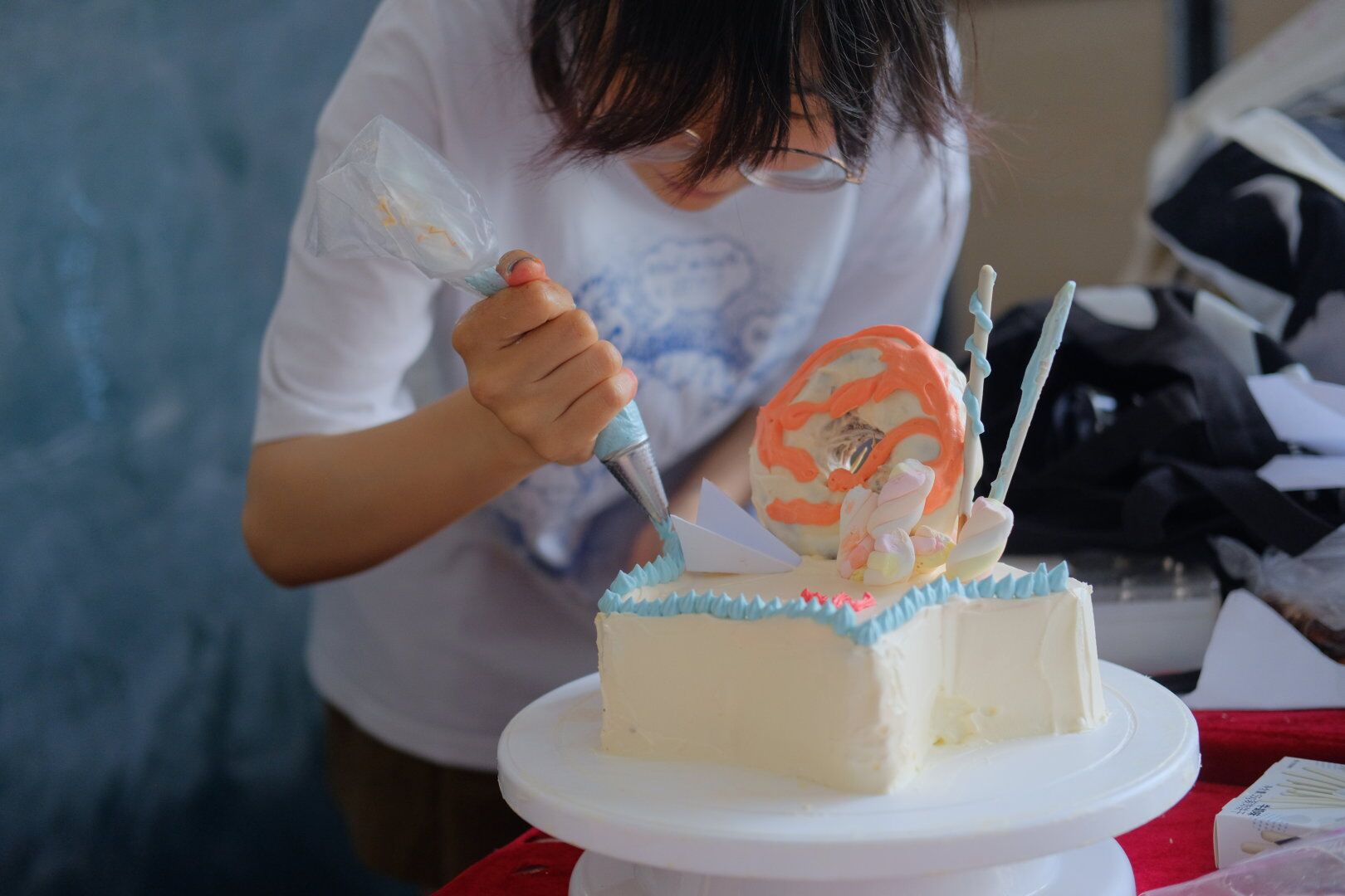 “庆百年”组用饼干堆出长城,绵延万里的巍巍长城,展现了中国人的家国情怀与中华民族坚韧不屈的傲骨。“弄潮百年”组用奶油画出了一艘小船,一百年前,中国共产党正是在一艘红船上诞生,经历了一百年的风风雨雨,中国共产党仍然坚定地向前,团结带领全国各族人民创造幸福生活和中华民族美好未来。“生临”组用蓝色与褐色渐变,象征蓝天与土地,上方摆放了中国共产党成立100周年庆祝活动标识,下方用花枝象征美好与希望,表达了对美好未来的祝愿。“万有引力”组以五角星的黄色为主色调,搭配代表青春的纸飞机和美好祝愿的甜甜圈,希望青年能够将青春梦融入中国梦,让理想展翅飞翔。