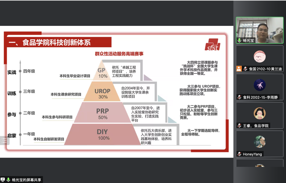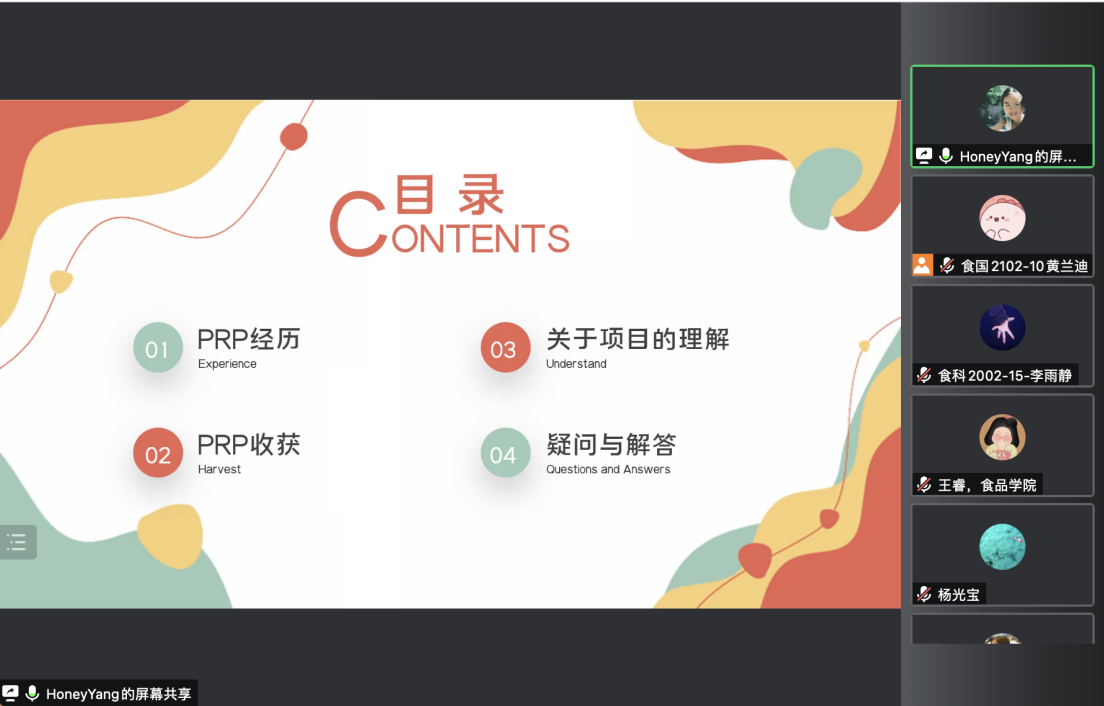 2022年6月2日晚,2021级PRP项目宣讲会在线上成功举行。食品学院竞赛辅导员杨光宝、2021级本科生辅导员张任,部分往届PRP项目代表,以及全体2021级本科参与活动。