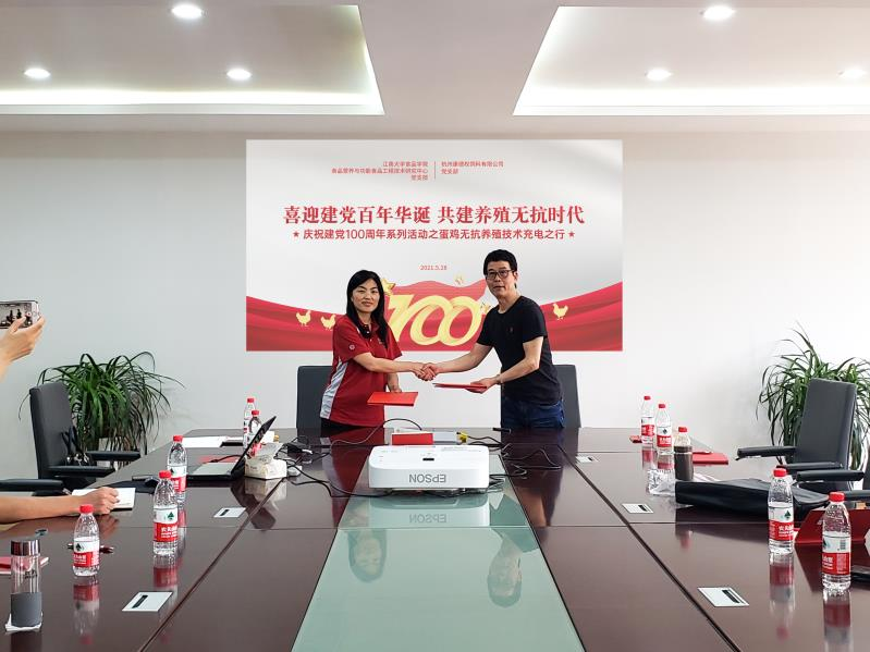 在支部共建会议上,康德权饲料有限公司王淼书记分享了党史学习心得,讲述了在教工党员的支持下推动校企合作、产业发展的合作历程。食品营养与功能食品工程技术研究中心成向荣书记表示,江南大学与杭州康德权饲料有限公司具有良好的合作基础,取得了双方满意的阶段性成果。在此基础上,杭州康德权饲料有限公司与江南大学食品营养与功能食品工程技术中心党支部进行支部共建,达成继续合作的意向,促成“丰”字寓意的企业增收、校企党建共赢的发展局面。朱建津教授与康德权饲料有限公司王淼书记签署了合作协议。