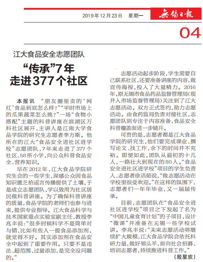 12月12日,江南晚报以《硕士、博士进社区宣讲“食品安全”累计服务群众1万余人》为题,对该项目的具体开展情况和引起的社会反响进行了报道。文中介绍,该项目自2012年创立以来,来自食品学院的400余名硕、博士研究生已走进全市近400个社区、58所小学,完成广场志愿服务7次,累计服务群众1万余人。志愿者的身影穿梭于无锡的各个行政区,真正践行了“惠及民生、造福百姓”的誓言与初心。