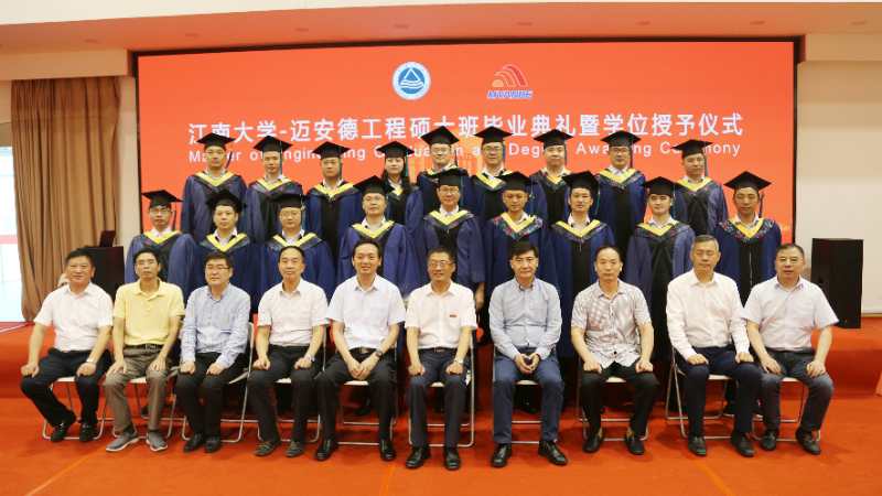 9月2日,江南大学-迈安德工程硕士班毕业典礼在扬州迈安德集团有限公司顺利召开。中国工程院院士、江南大学校长陈卫教授,校长助理、研究生院、学科建设处处长堵国成教授,食品学院院长刘元法教授,与迈安德董事长徐斌、总裁荣臻一同出席毕业典礼。参加本场活动的还有江南大学导师金征宇教授、王兴国教授、金青哲教授和洪雁教授等,以及迈安德公司副董事长汪沐、生产总监毛卫江、营销总监周斌、技术总监徐静等。