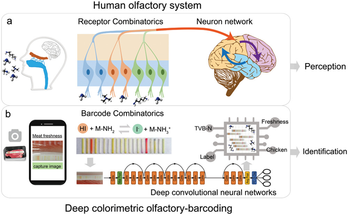 近日,江南大学胥传来教授和新加坡南洋理工大学Xiaodong Chen教授团队合作,模拟人的嗅觉系统,基于指示剂变色原理和深度卷积神经网络,通过手机扫描,实现了包装食品的新鲜度实时监测,准确率可达98.5%,工作于10月1日在线发表于Adv. Mater. 2020, 2004805 https://onlinelibrary.wiley.com /doi/ 10.1002/adma.202004805。
