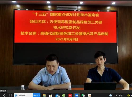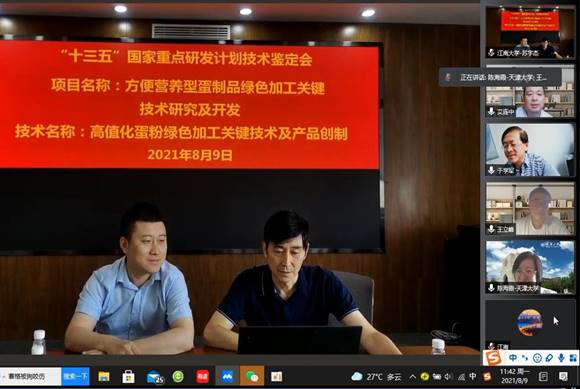 8月9日,中国轻工业联合会以视频会议的方式主持召开了“高值化蛋粉绿色加工关键技术及产品创制”项目技术鉴定会。该项目由bat365在线官方网站杨严俊教授主持,江南大学、江苏大学、荣达禽业股份有限公司、江西农业大学、西北农林科技大学五家单位共同完成。江南大学科研院副院长范大明、项目负责人杨严俊教授及项目主要成员参加了鉴定会。