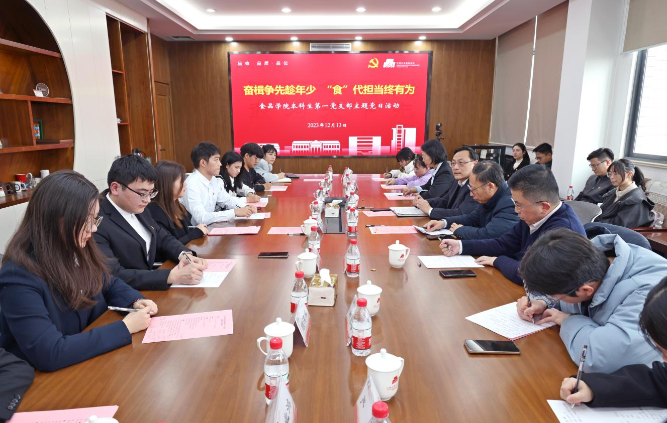 12月13日下午,食品学院本科生第一党支部举办“奋楫争先趁年少,‘食’代担当终有为”主题党日活动。校党委书记吴正国,党委组织部常务副部长方正泉,食品学院党委书记傅莉莉、副书记李雷、专职组织员、党建辅导员与本科生第一党支部全体成员参加活动。活动由党支部书记曹敏主持。