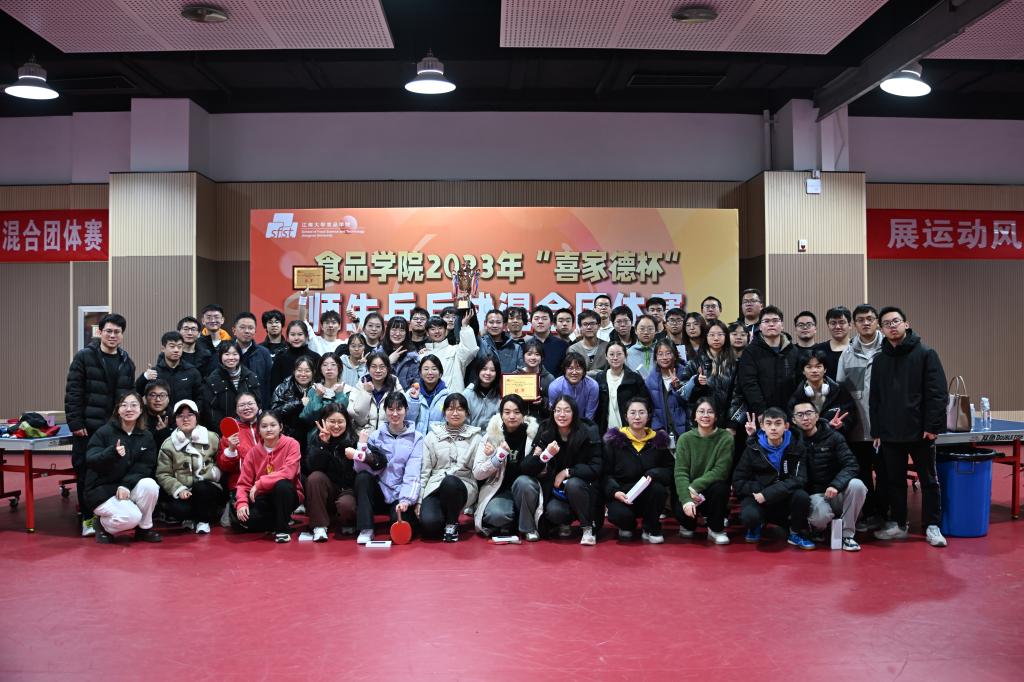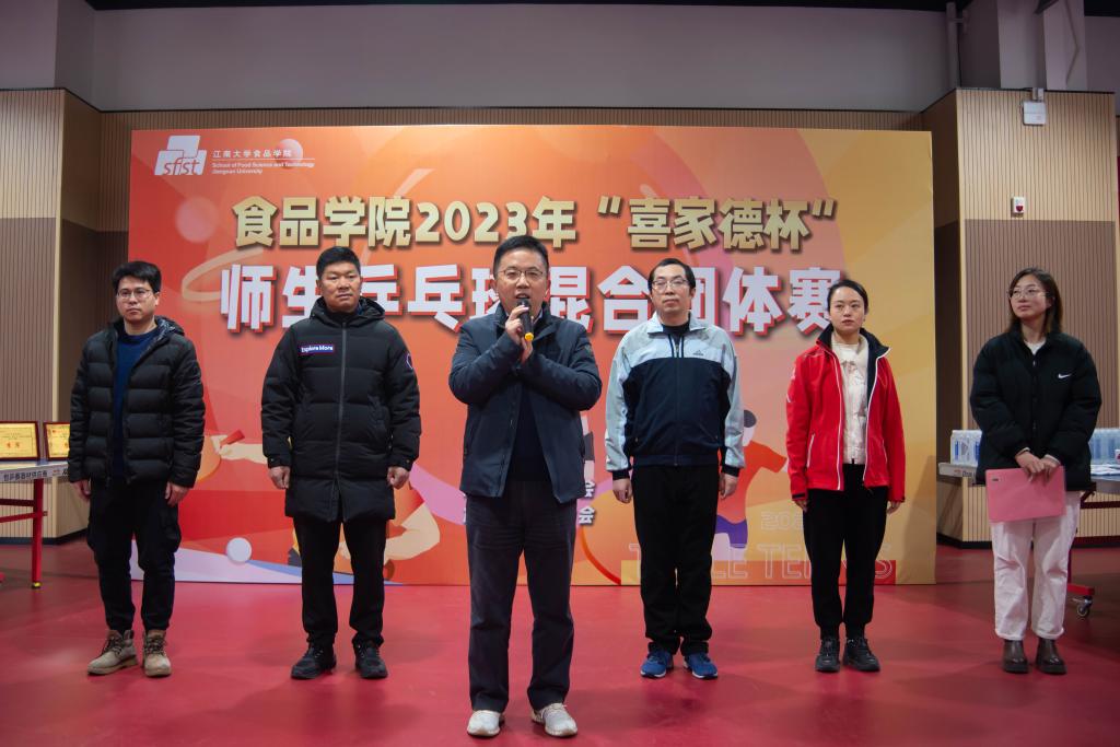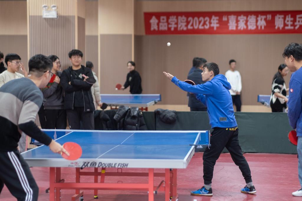 12月17日,bat365在线官方网站2023年“喜家德杯”师生乒乓球混合团体赛在学校体育新馆火热开赛。食品学院党委副书记李雷、副院长程力,体育部副主任赵来安,学院人事秘书邓理、分团委书记李金杰及120余名师生参与本次活动,共享国球魅力。