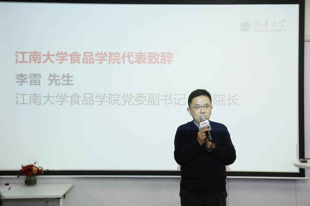 李雷介绍食品学院创新育人理念,他指出,本次大赛有效拓展了学院与企业之间的交流,希望通过大赛让学子充分体验数字化驱动下的未来厨房变革,全面提升创新素养。