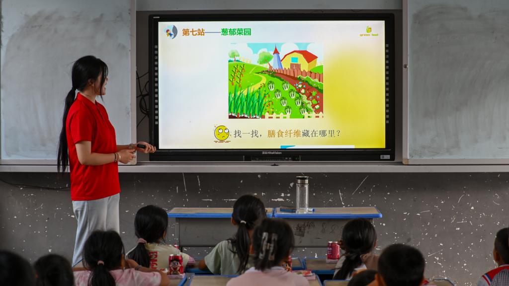 “蔬果巧搭配,健康欢乐多”,贵州从江县独洞小学的小朋友们正在和小肖老师一同齐声朗读蔬果搭配口诀,一堂丰富有趣的儿童食育课正在开展中。从江南水乡到云贵高原,跨越1600余公里,7月中旬,江南大学“筑梦从江 健康食育”社会实践团奔赴贵州省从江县,开展乡村振兴产业调研和食育科学普及教育。