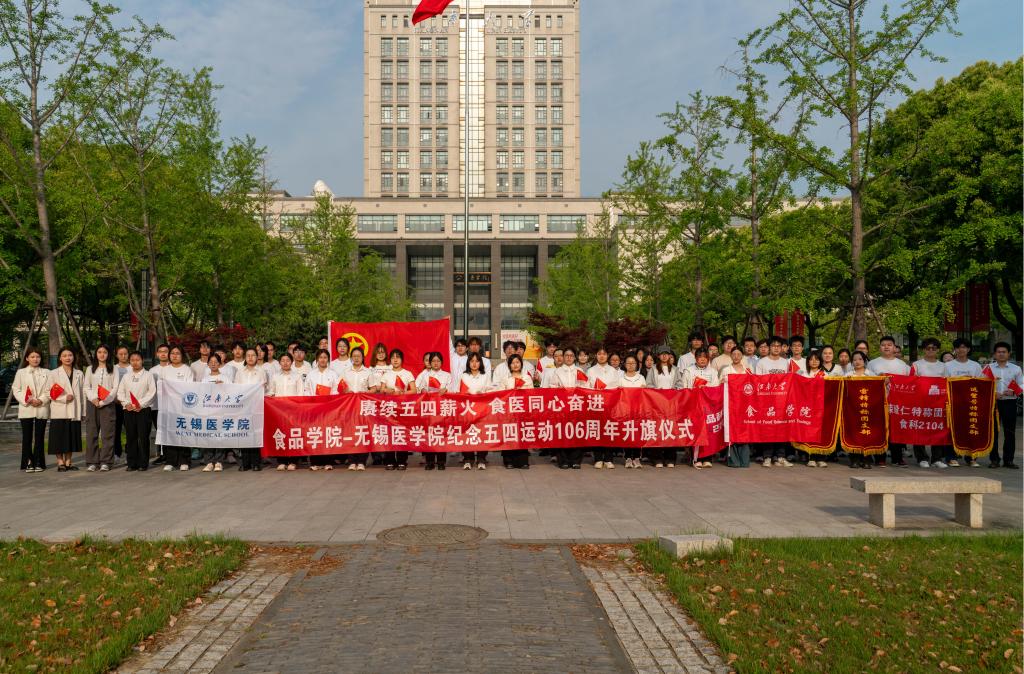 赓续五四薪火,食医同心奋进,此次升旗仪式不仅是一场生动的爱国主义教育实践,更是一节激励青年奋楫前行的思政课堂。未来,食品学院和无锡医学院将继续引领青年学子践行五四精神,在党的旗帜下铸就理想信念之魂,用创新实践回答时代之问,让青春在强国建设和民族复兴的壮阔征程中绽放绚丽之花!