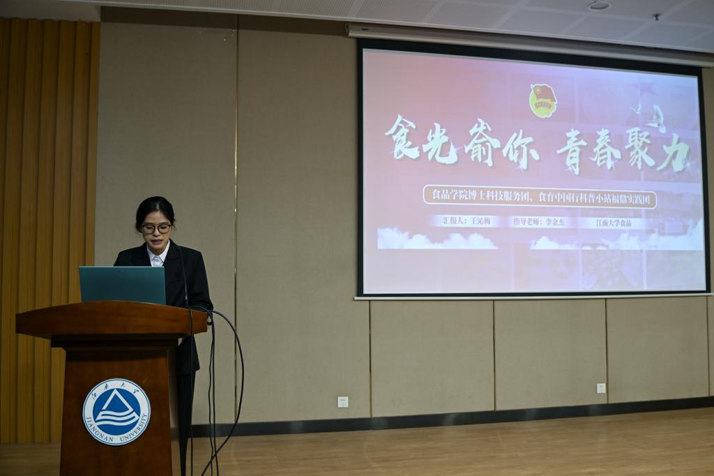 “南国北疆”社会实践团代表胡峰分享了团队联合石河子大学学子,在新疆这片热土上的故事,跨越4793公里聆听沙海老兵扎根边疆的英雄事迹,用食品科普助力乡村发展和儿童健康,切实发挥一流学科优势和青年的所学所思;“食光嵛你”社会实践团代表王沁梅介绍了团队赴福建福鼎嵛山岛,联合“清华大学乡村振兴工作站”,以科技赋能乡村产业,研发出低糖月饼与地瓜脆条,为海岛孩子开展食育课堂,为当地乡村振兴发展贡献江南力量;“华夏拾光者”社会实践团代表倪红箔分享了团队成员暑期在15座博物馆进行实践考察的收获,他们参观探寻馆藏珍品,感受历史发展变迁,体会中华文明生生不息的蓬勃力量,让厚重的历史与青春的脉搏同频共振;“赓续红色基因,共绘中国红”社会实践团代表王子凡分享了团队奔赴各处红色场馆的经历,追寻红色足迹,感受红色精神,食品学子们领悟“生逢其时,重任在肩”的责任与使命。
