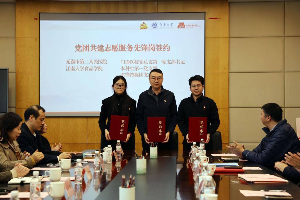 为进一步深化“党建带团建”的优良传统,增强青年学子服务“健康中国”的责任感,会议现场还举行了“党团共建志愿服务先锋岗”签约仪式。无锡市第二人民医院(江南大学附属中心医院)门诊部主任冯军、食品学院学工办主任李金杰及本科生第一党支部书记、辅导员崔家玮分别代表双方党团组织签署了协议。