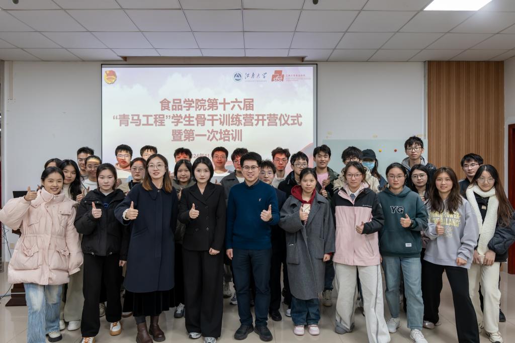 11月27日晚,食品学院第十六届“青马工程”学生骨干训练营正式开营。学院学工办主任兼分团委书记李金杰,2022级本科生辅导员张任,共青团江苏省委青年讲师团成员、bat365在线官方网站马克思主义学院2024级博士研究生肖洋及第十六届青马训练营全体营员参加仪式及第一讲活动。