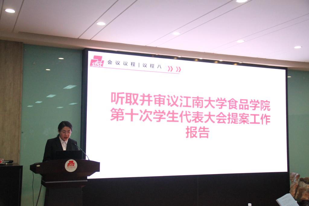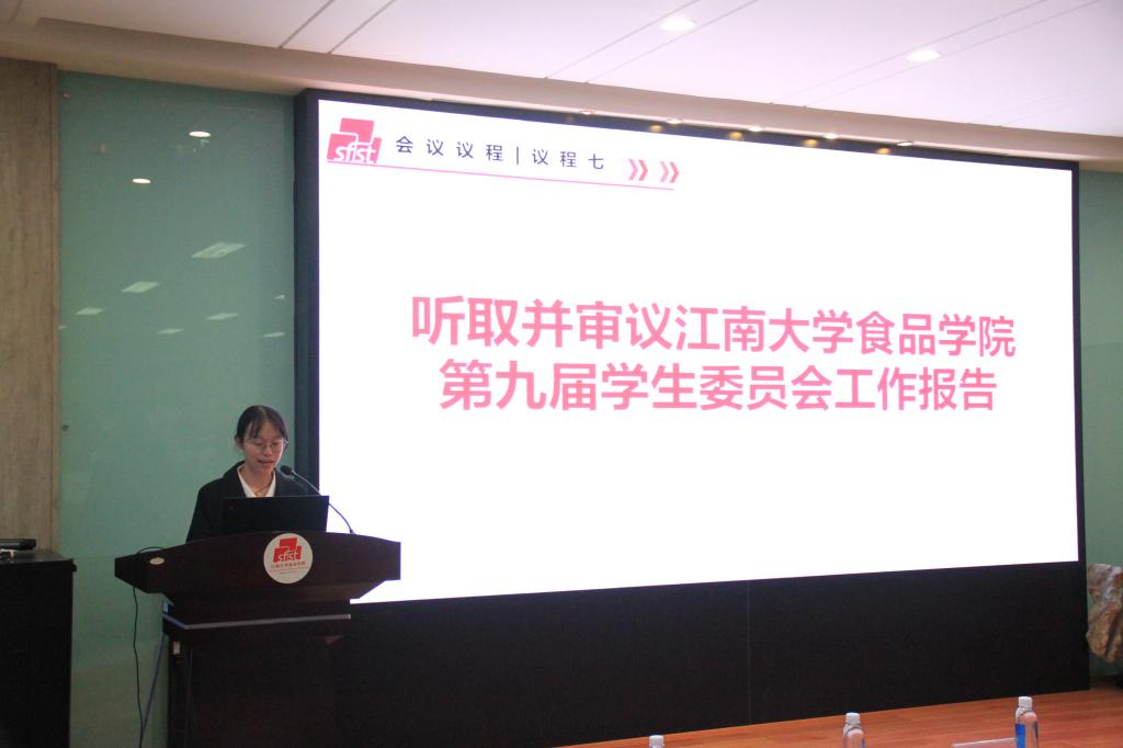 食品学院学生会执行主席蔡劭恺代表第九届学生委员会向大会作题为《牢记使命创佳绩,奋勇争先铸辉煌,锐意进取,砥砺前行,共绘学生工作新蓝图》的工作报告,从思想引领、学风建设、能力培养、改善结构等方面回顾过去一年学生会的工作,系统总结了取得的主要成绩和经验,明确今后学生会组织工作的奋斗目标和主要任务。