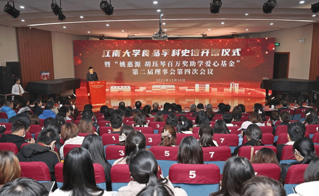 12月10日下午,江南大学食品学科史馆开馆仪式暨“姚惠源 胡珏琴百万奖助学爱心基金”第二届理事会第四次会议在江南大学北区学生活动中心隆重举行。