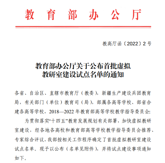 近日,教育部发布了《关于公布首批虚拟教研室建设试点名单的通知》(教高厅函[2022] 2号),全国共439个虚拟教研室获批试点建设,我院由刘元法教授主持的食品科学与工程专业虚拟教研室入选专业建设类试点建设名单,由夏文水、陈洁教授主持的食品工艺学课程群虚拟教研室入选课程(群)教学类试点建设名单。