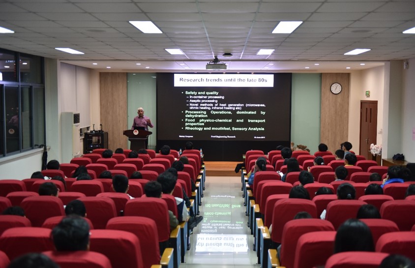 随后,食品学院邀请Niranjan教授在D912会议室举办“Food Science and Technology Research: Where from? And where to?”的学术讲座。讲座由bat365在线官方网站院长助理徐勇将教授主持,近120名食品学院本科生参加了讲座。讲座伊始,徐勇将教授简单介绍了Niranjan教授的工作经历、教学领域及研究领域,并对此次教学活动表示感谢和热烈欢迎。讲座中,Niranjan教授重点介绍了自上世纪80年代至今的食品研究发展,围绕从食品保藏转变到食品品质与健康、从食品加工过程研究转变到产品开发研究、从以农业为核心的食品研究转变到以消费者为核心的食品研究等核心方面,深入分析了食品发展历史及未来趋势,同时指出了食品行业高质量发展的良好前景。接着,Niranjan教授和Qiaofen Cheng教授与同学们进行了良好互动沟通,对同学们提出的问题进行了详细解答,现场气氛热烈。最后,Niranjan教授对同学们提出了殷切的期望并表达了美好的祝愿,希望同学们充分认识食品行业的良好发展前景,不断开拓国际视野,刻苦钻研,学有所成。