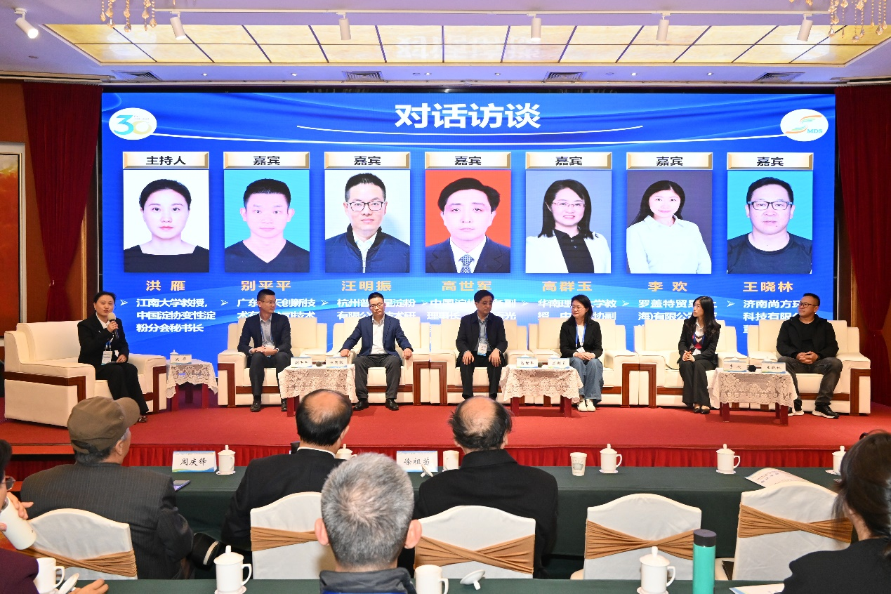 会议特邀山东寿光巨能金玉米开发有限公司总经理高世军、华南理工大学高群玉教授、杭州普罗星淀粉有限公司技术研究与创新工程师汪明振、广东海天创新技术有限公司技术部主管别平平、罗盖特贸易(上海)有限公司亚洲区法规李欢、济南尚方环保科技有限公司董事长王晓林进行访谈,分别从变性淀粉行业的重要性及发展趋势、高校基础研究对变性淀粉行业发展的支撑策略、变性淀粉生产企业实现生产-应用-市场融合贯通的途径、变性淀粉用户对变性生产企业产品研发与应用研发的需求、国内外变性淀粉法规方面的差异性及大健康时代背景引导消费者理性对待食品添加剂的必要性、MBR(膜生物反应器)在变性淀粉污水处理领域的技术优势等方面进行对话。