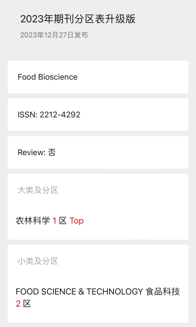 2023年12月27日,《2023年中国科学院文献情报中心期刊分区表》正式发布,爱思唯尔出版集团与江南大学合作主办的食品类期刊《Food Bioscience》升至2023年中科院期刊分区表农林科学1区TOP期刊行列。