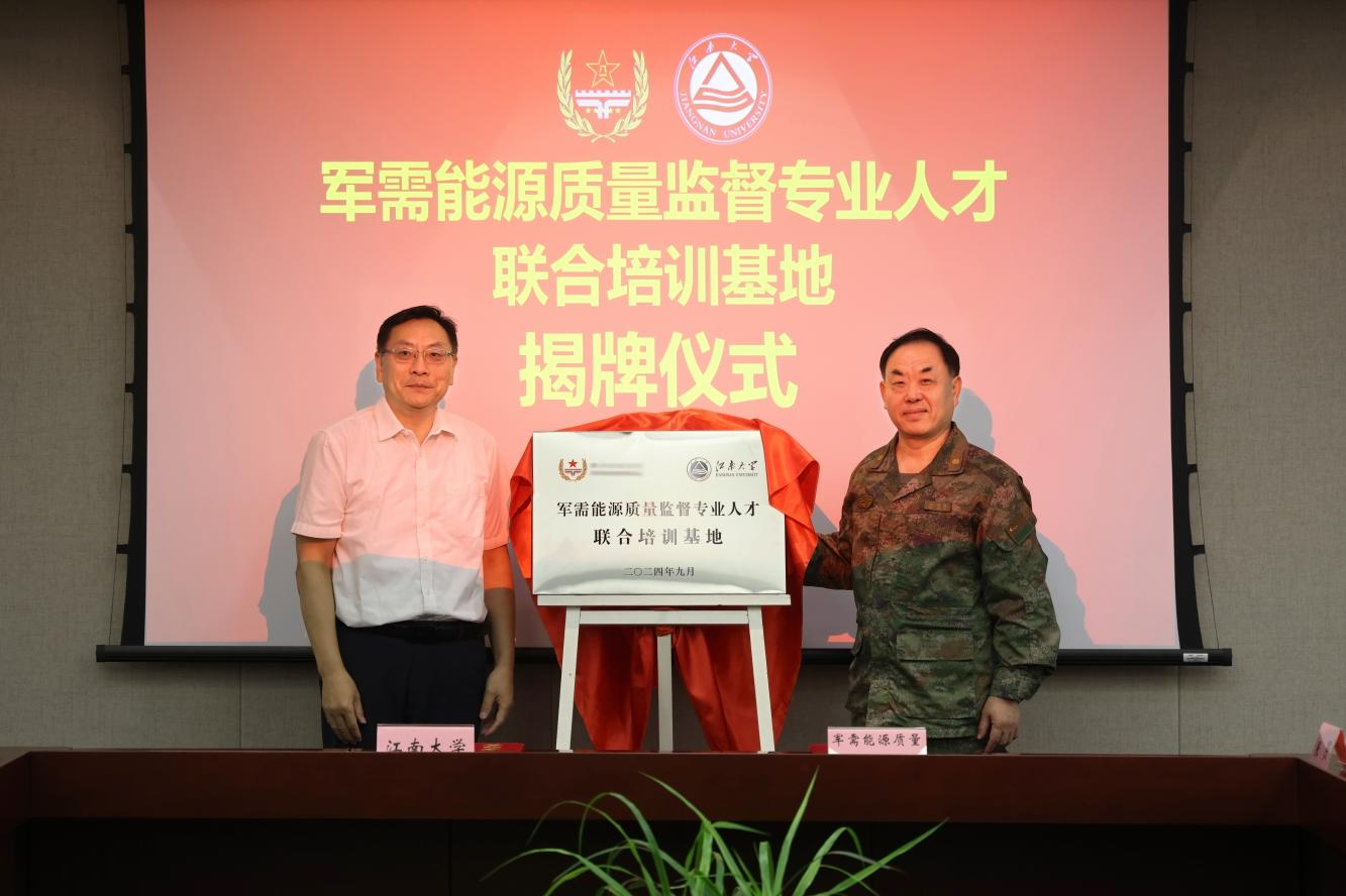 近日,江南大学—联勤保障部队军需能源质量监督专业人才联合培训基地签约暨揭牌仪式在bat365在线官方网站举行。联勤保障部队某总站党委书记(军方领导),bat365在线官方网站党委书记吴正国、党委办公室主任王维、教务处处长兼本科招生办公室主任李兆丰、食品学院党委书记傅莉莉、纺织科学与工程学院党委书记张菁燕等出席仪式。仪式由傅莉莉主持。