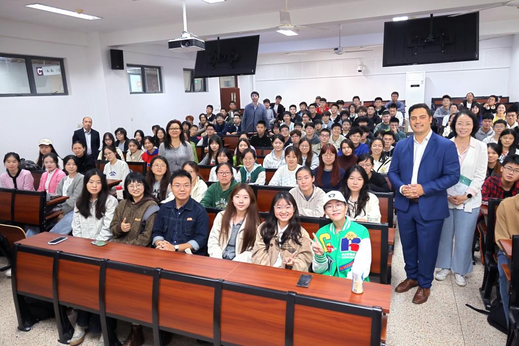会前,Tere McGonagle-Daly一行前往第二教学楼,与食品学院国际班学子亲切会面。他向大家介绍梅西大学的办学条件与生活环境,鼓励同学们努力学习、充分准备,盼望尽快在新西兰聚首。