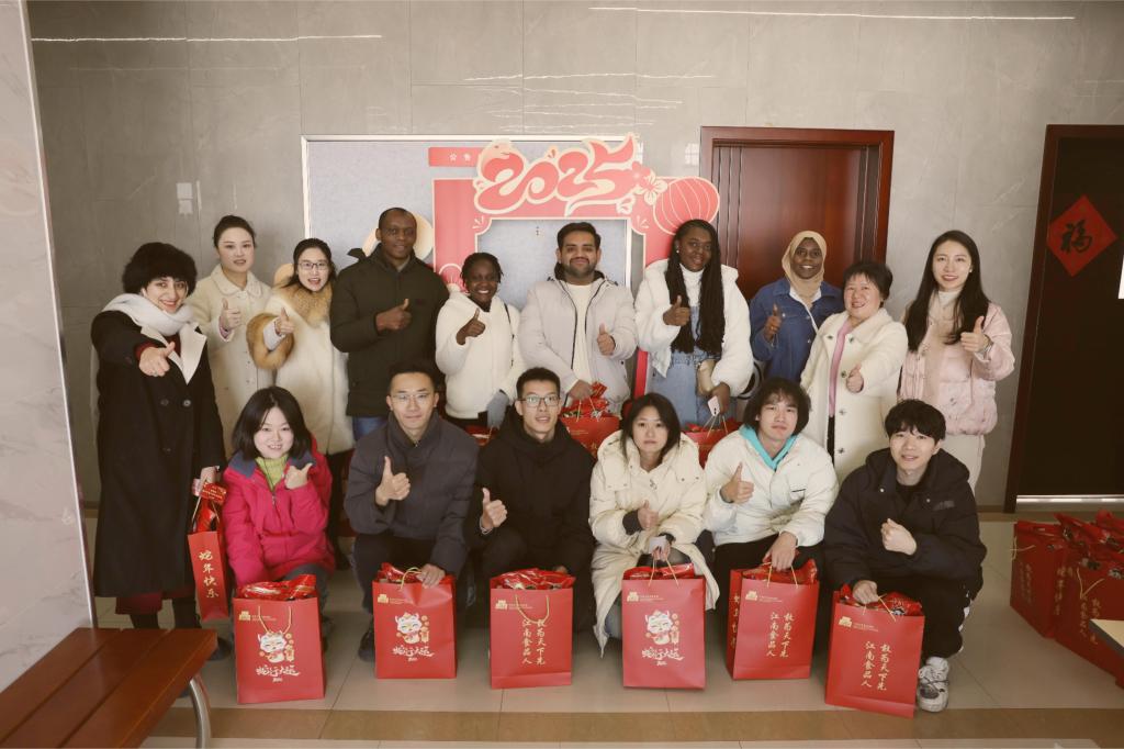 1月27日上午,食品学院副院长孙秀兰、学工办副主任吴爽与研本辅导员为近百名留校过年的中外学子发放新春暖心大礼包,包括白象方便面、旺旺零食、学院文创等丰富的内容。礼包寄托了学院对每一名留校学子的深切关怀和新年祝福。老师们亲切鼓励大家在新的一年里继续努力,不断进步。活动现场还设置了“2025金蛇送福”主题背景以及学院吉祥物新春纪念拍照区。同学们踊跃参与,与可爱的吉祥物合影留念,用相机捕捉下这难忘的一刻,与远在家乡的亲人分享这份喜悦和温暖。