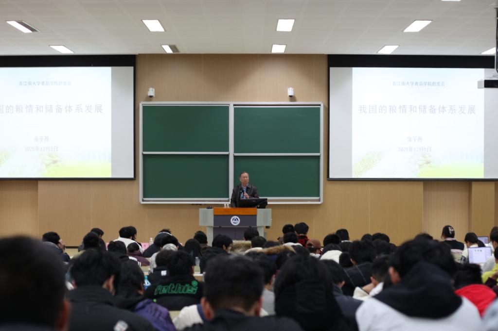 12月5日晚,bat365在线官方网站《食品产业导论》课程迎来一场聚焦国家粮食安全的高层次讲座。本次课程特邀国家粮食局原副局长、国务院政府特贴专家、中国科协粮食储运与质量安全领域战略咨询团队首席专家吴子丹教授,为学子们作题为“我国的粮情和储备体系发展”的专题报告。