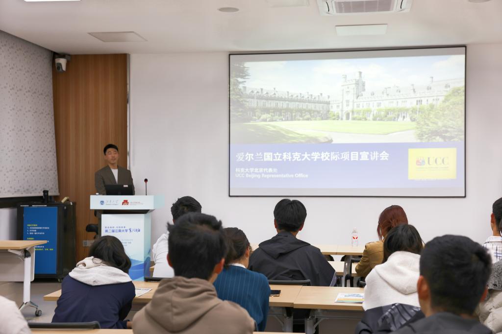 UCC北京代表处招聘专员赵子豪为学院本科生作联合培养项目宣讲,详细介绍项目的课程设置、申请条件及奖学金政策。该项目旨在为食品学院本科生提供赴爱尔兰深造的机会,培养具有国际视野的高层次食品专业人才。