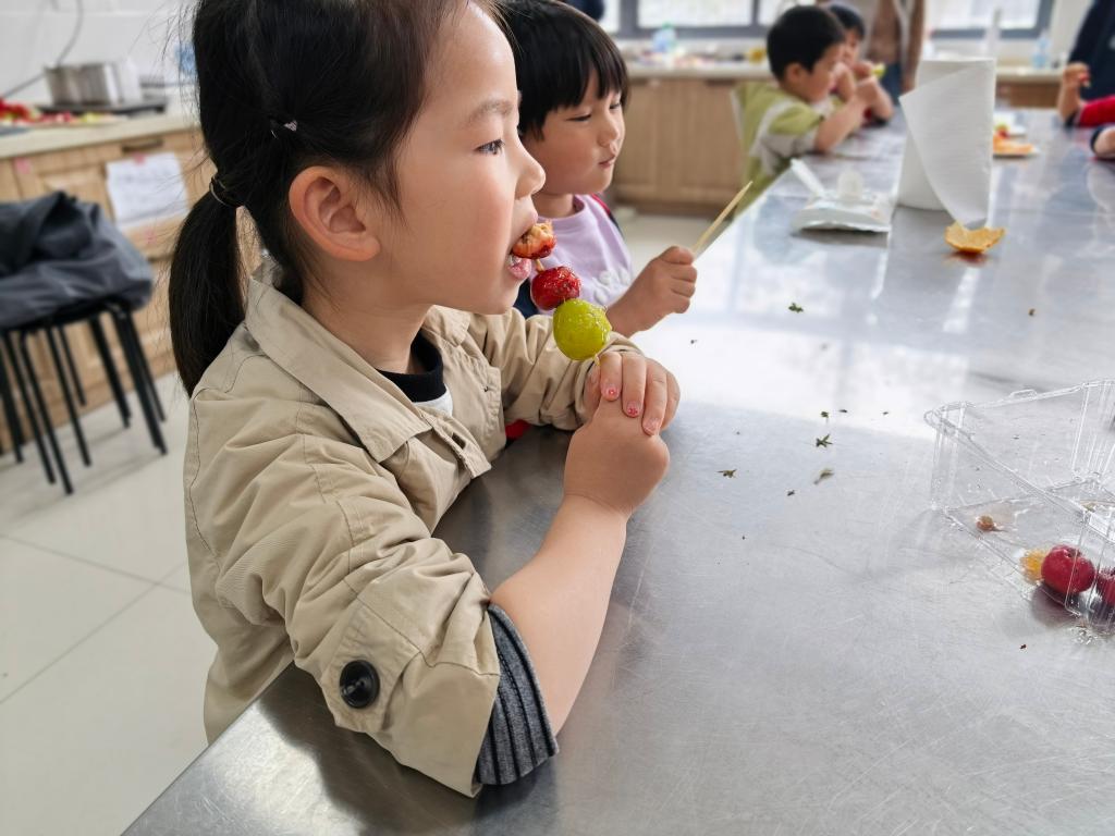 理论科普结束后,迎来最受期待的动手实践环节。在老师与助教的指导下,孩子们规范洗手、准备食材,认真完成串果、熬糖、蘸糖、冷却等步骤,亲手制作出晶莹剔透的冰糖葫芦。大家专注投入、互相协作,沉浸式体验传统美食的制作乐趣,在动手操作中巩固科学知识,感受食物从原料到成品的奇妙变化,脸上洋溢着收获与喜悦。