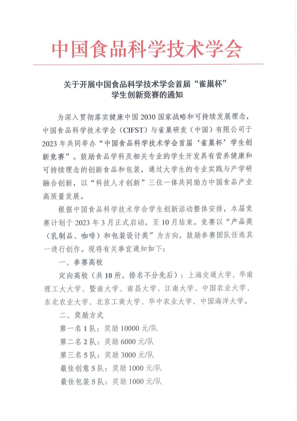 中国食品科学技术学会(CIFST)首届“雀巢杯“学生创新竞赛